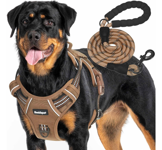 Прочная тактическая шлейка для собак, размер L, коричневая - предотвращает рывки, светоотражающая, система Molle, бирка с защитой от потери, дополнительный поводок.