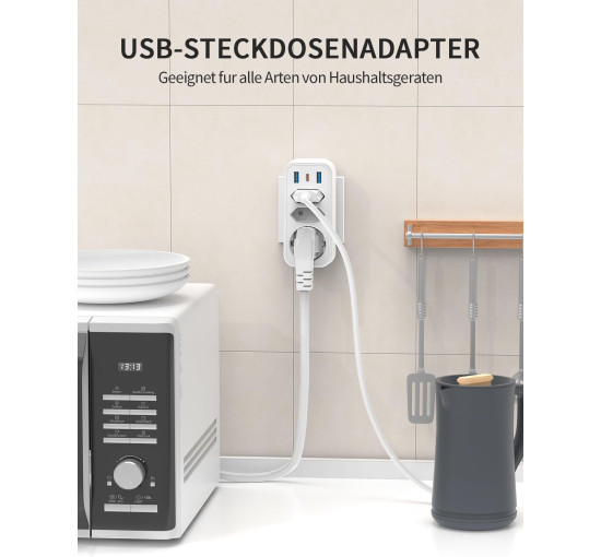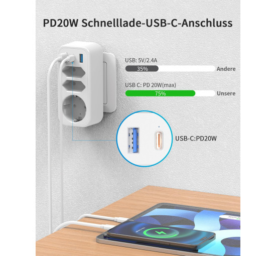 Швидке заряджання PD20W: один порт USB-C адаптера оснащений технологією швидкого заряджання PD20W, а багатофункціональна розетка з USB-портом дозволяє використовувати кілька побутових приладів одночасно.